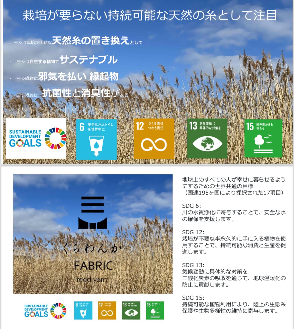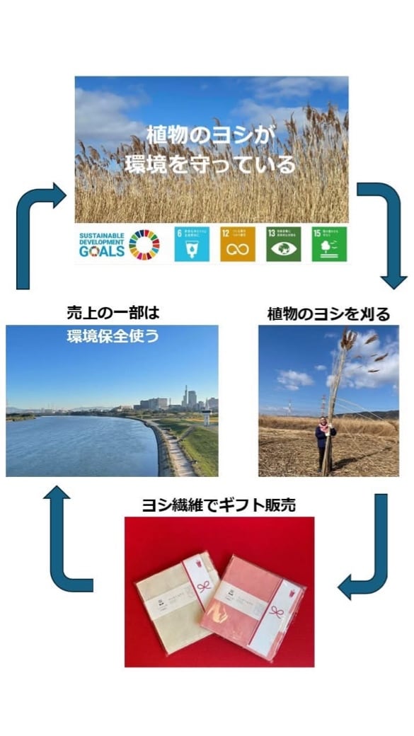 この製品の売り上げの一部は淀川の環境保全に使われています。またヨシ繊維は抗菌性や消臭効果が特徴とされています。